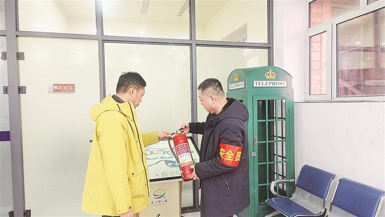 生态旅游发展公司安全员在“龙江第一湾”游客服务中心核验灭火器的压力值、有效期和完好性