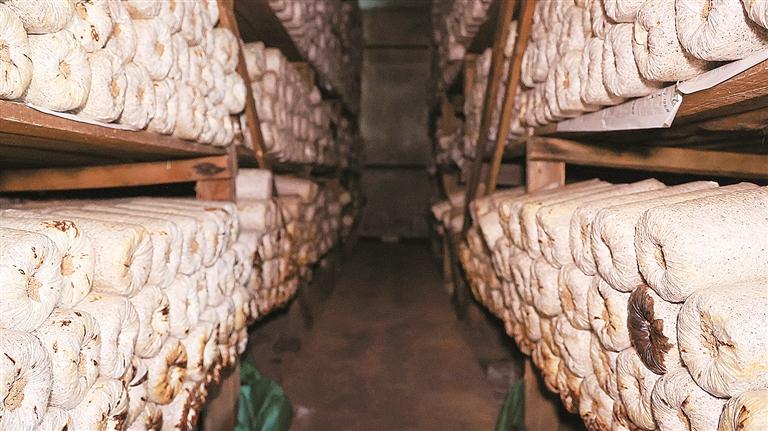一排排菌包在架子上整齐排列,培育人员每日定时观测、精细管护,严格控制温湿度,为灵芝菌丝营造最稳定的生长条件