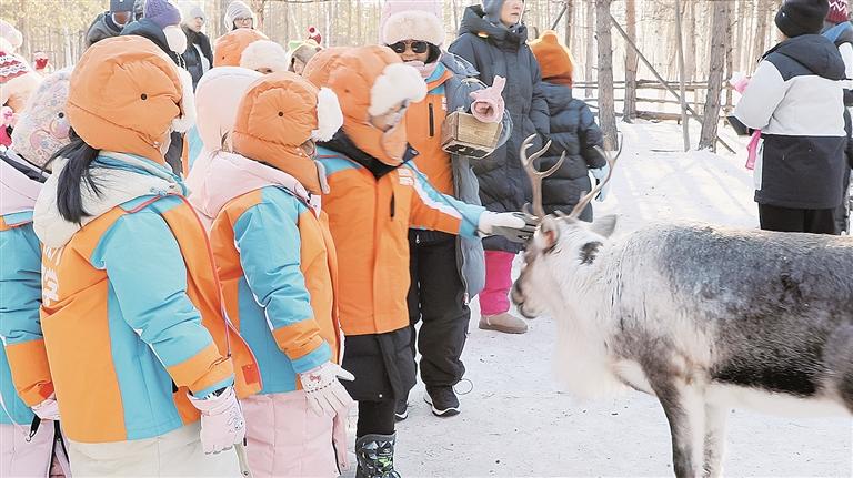 孩子们走进鄂温克驯鹿园,与温顺的驯鹿亲密接触
