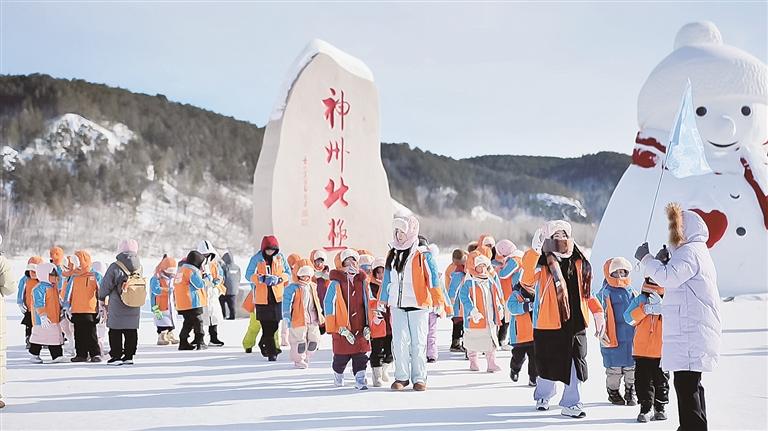 孩子们在神州北极标志前感受东北冰雪文化