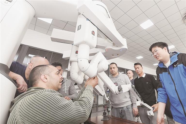 4月16日,在哈尔滨思哲睿智能医疗设备股份有限公司技术服务培训中心,技术人员对国外的临床支持工程师进行培训。